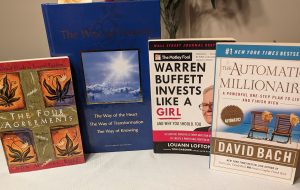 from the left: The Four Agreements, The Way of Mastery, Warren Buffett Invests Like A Girl, The Automatic Millionaire